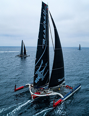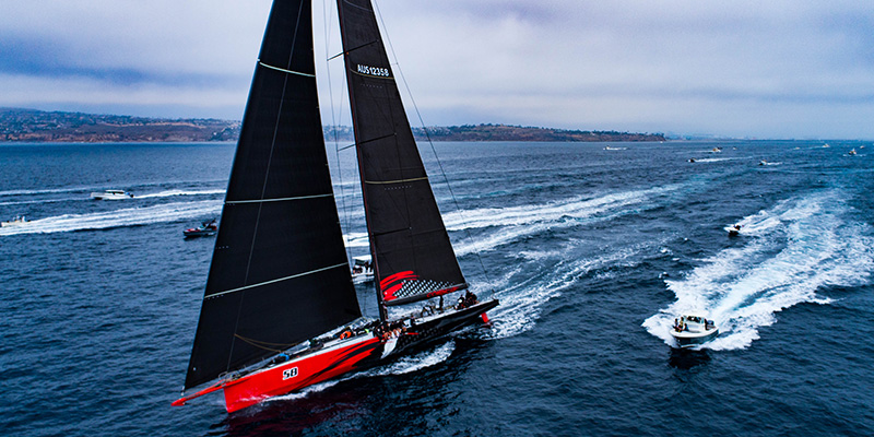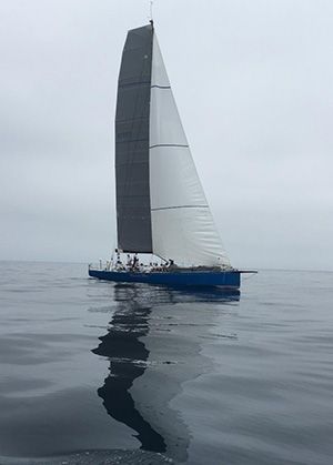 With the breeze shifted far left in overcast skies due to a strong Catalina Eddy, the final wave of 24 monohulls and 4 multihulls in a record fleet of 90 yachts are now headed off the coast in the 50th edition of Transpacific Yacht Race, a biennial race to Honolulu organized by the Transpacific YC. These are the largest and fastest boats in the fleet, and their starts were an impressive display of masterful big-boat sail handling, seamanship and tactics as they charged the line on port tack with a variety of headsail types suitable to the close reaching angle sailed to clear the West End of Catalina, the only mark of the course in this 2225-mile race.