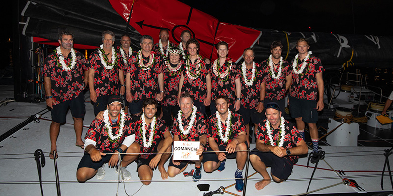 After the same slow start that plagued all Saturday starters this year in the 50th edition of the LA-Honolulu Transpac, Jim Cooney and Samantha Grant's VPLP 100 Comanche still managed to sneak out of the light air, get into the offshore breeze, and sail on to be first to finish in Honolulu at 21:14:05 Hawaii time. For being the first monohull to cross the finish line at Diamond Head, the Comanche team will win the coveted First to Finish carved slab of Hawaiian Koa wood known as the Barn Door Trophy. From 2009-2017 this award was given only to yachts with no powered systems, but was re-dedicated this year for monohull yachts of all sizes and types.