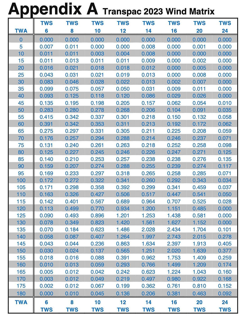 Race managers at Transpacific Yacht Club have developed a matrix of values for this range of wind speed and angle that represents a historic average of conditions in a typical Transpac race. Each entry’s Transpac rating is thus calculated using this model and expressed in terms of a Time-on-Time (ToT) coefficient. The boat’s rating in ToT multiplied by its elapsed time is the corrected time for that boat.