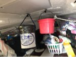 In the attached image you will note two buckets as required by the Transpac NOR. The reason they are hanging from the ceiling is that we have been using them to catch some of the sea water that leaks through the forward hatch when we dig into a big wave. In a 33 foot boat with 4’-6” headroom and an 8’ beam, everything needs to do double duty. In fact, the bucket on the left is doing triple duty - it’s also our head.