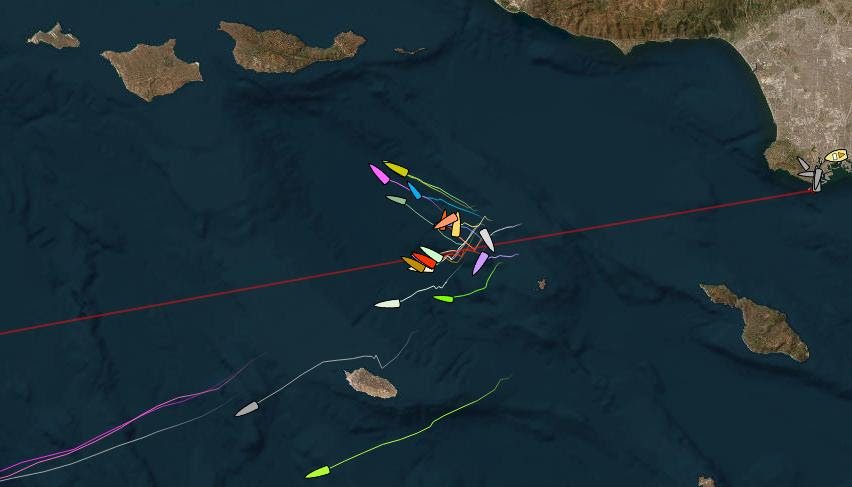 In contrast there’s not much light-hearted humor being expressed among yesterday’s starters. After getting off the start line and around the West End of Catalina, most tacked to port and headed northwest. Unfortunately most got stuck for hours in light and drifting conditions among the outer Channel Islands, with Marchetta/Furey’s Santa Cruz 70 MIRAGE reporting “Fended off a sea lion looking for a resting place, marine mammal presumed we were another rock....”