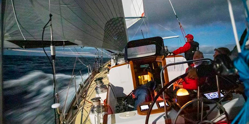 Very slow off the start – hard to get 45 tonnes rolling in 6kts of breeze. We hung on slowly losing ground until past Catalina when the wind started its slow climb from 8kts to where it peaked (at least for now) about 3 hours ago at 30. We currently have full main #3 and mizzen up and rolling along in quite an uncomfortable sea, close reaching but making good time. A few rumbly bellies first night out!