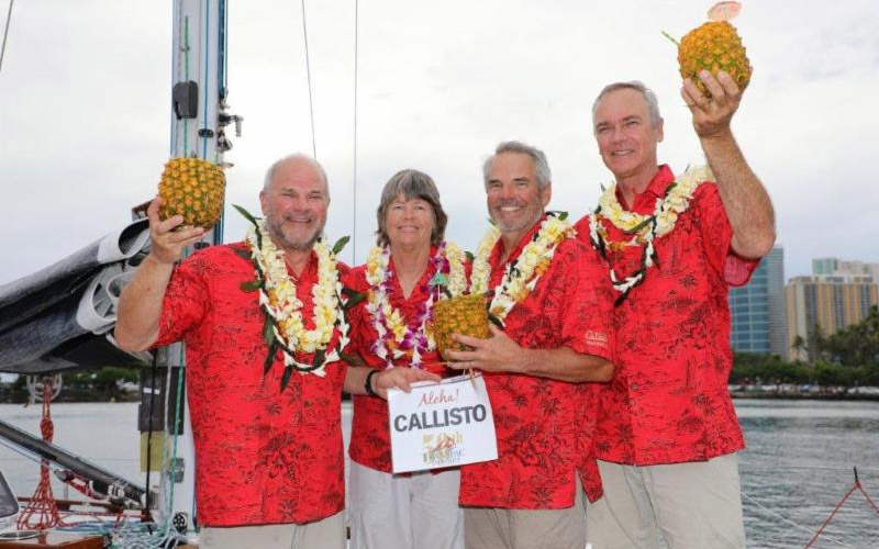 The first to finish Cal 40 from Division 10 was The Eddy Family's Callisto, who crossed the finish line at Diamond Head buoy at 5:11 PM local time, while the next boat in the class finishing an hour later was Don Jesberg's Viva, followed byRodney Pimentel's Azure coming in just about an hour after that at sunset. The Cal 40's are an emotional favorite at the Transpac, being for some the pivotal design that bridged the old and new era's of yacht design, and one that in their heydey dominated the top results in this race.