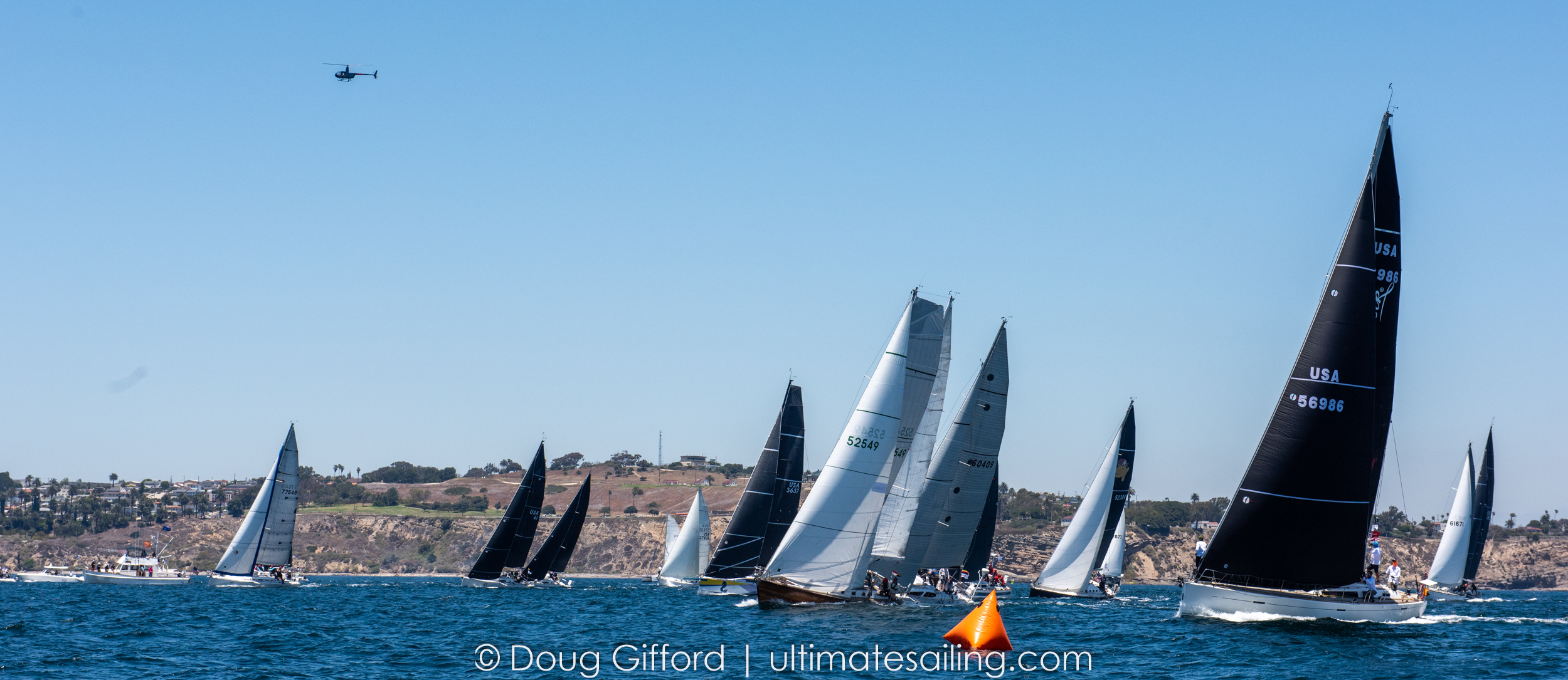 Just moments before today’s start, LA’s fireboat blasted a celebratory spray of Pacific brine, dousing the starting area amidst a 10-12 knot westerly that was gusting to 15+ by the first signal. A dragging leeward mark required a 20-minute postponement to ensure a proper line, but—come 1320—the starting gun fired in earnest, and the fleet set off on the adventure of a lifetime.