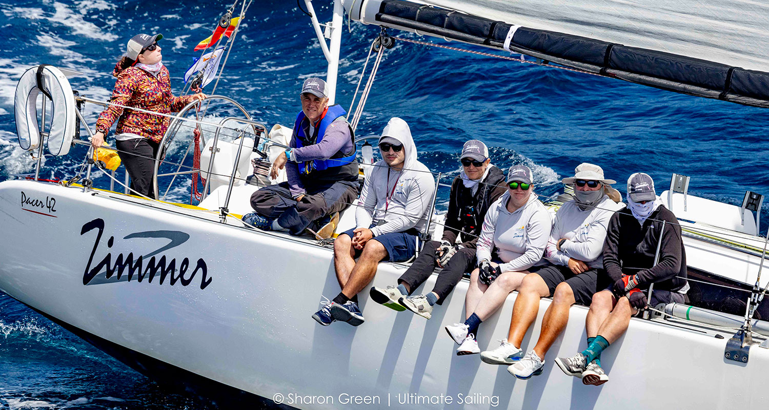 All 16 boats started cleanly and on starboard tack. At the time of this writing, a cluster of four frontrunners was forming: Mike Sudo’s Beneteau 47.7 Macondo, Michael Marion’s Dufour 525 Insoumise, Samantha Gebb’s Pacer 42 Zimmer and Andy Schwenk’s Custom 49 Sir Edmund.