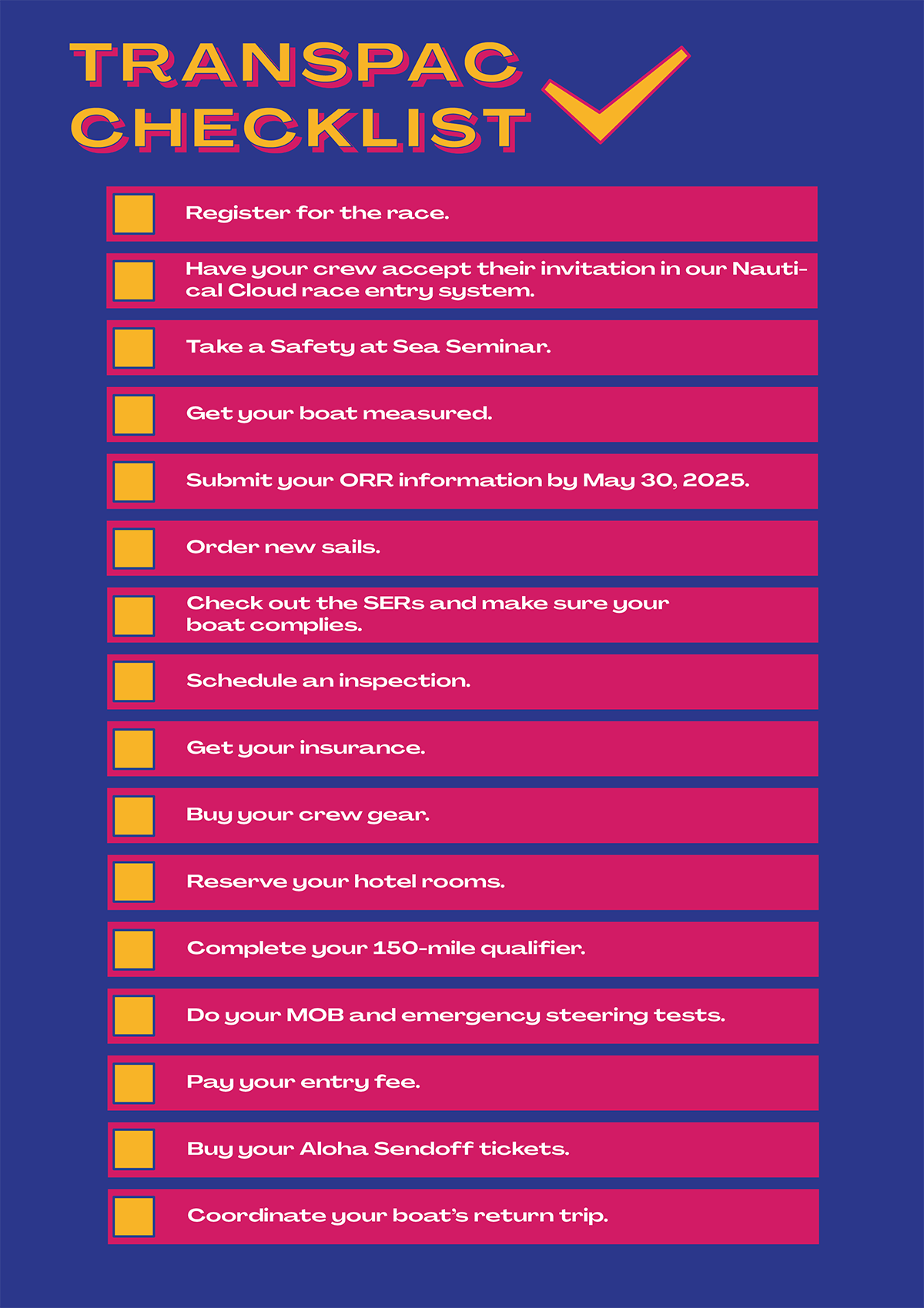 Join this dynamic lineup of competitors for the race of a lifetime! Navigate your way to our customized Nautical Cloud platform where owners can create an account, add basic boat details and officially enter the race with the $250 entry deposit.