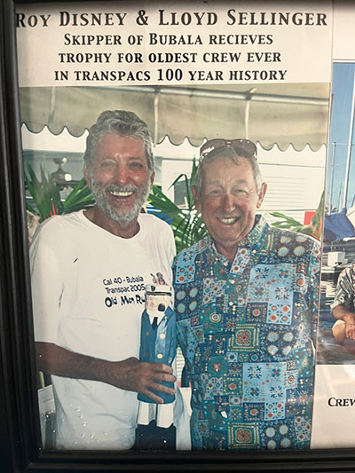 As I wrapped up our pre-race safety briefing at the Santa Barbara dock before the start of the SoCal 300, I decided to dedicate the race to my dad who was my inspiration for sailing and my inspiration for the Transpac Yacht Race. My dad passed away on May 22nd at the ripe old age of 90, just a few days prior to the race. I told the team the story of his 2005 Transpac and shared the photo of Roy Pat Disney handing my dad an unsanctioned award for the oldest crew. I am not sure if that record still stands. As I finished the story, I stood up and just then there was a Cal 40 crossing our bow on their way out and I yelled “what number Cal 40 are you?” - the response was “number 141”. It took my breath away for a moment as that was my dad’s Cal 40 which I had just been talking about and had spent my youth on, and they were headed out to start this race! Was this a sign??